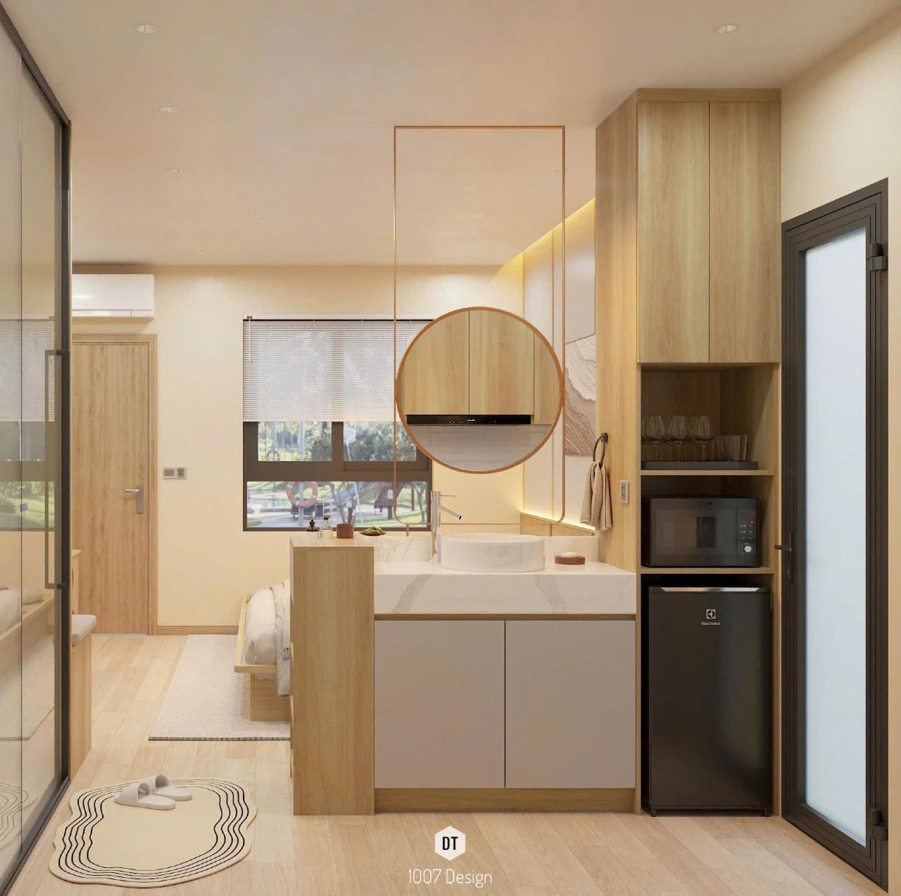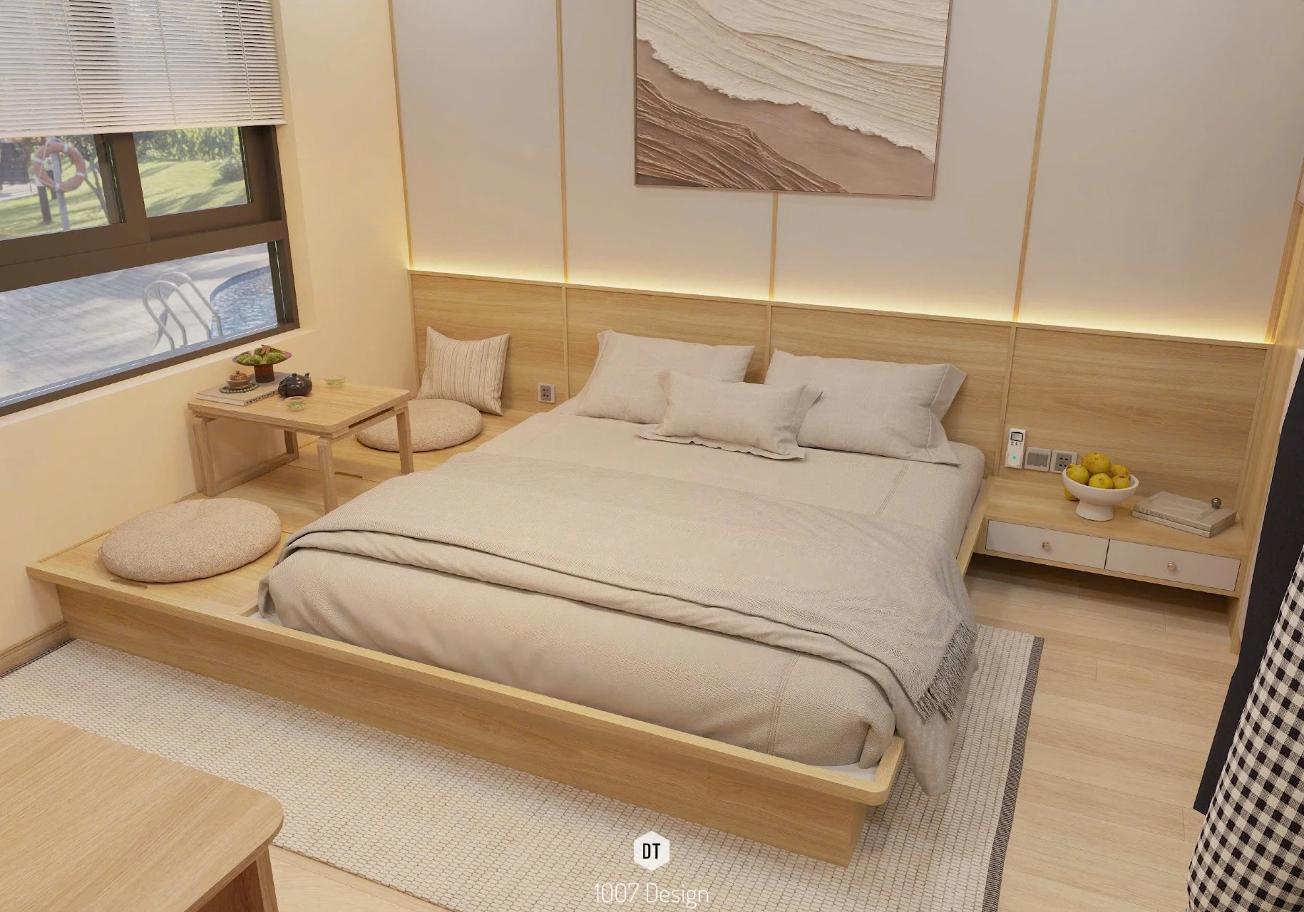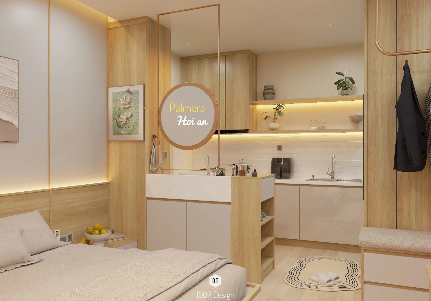 Căn studio nằm tầng 1 ngay bên cạnh hồ bơi, mở cửa kính tràn là view hồ bơi xanh mát + vườn cây thoáng đãng cả ngày. Tone màu pastel nhẹ nhàng, ánh sáng tự nhiên ngập phòng, gió lùa mát rượi, sống chậm mà vẫn sang chảnh giữa lòng thành phố/Hội An.