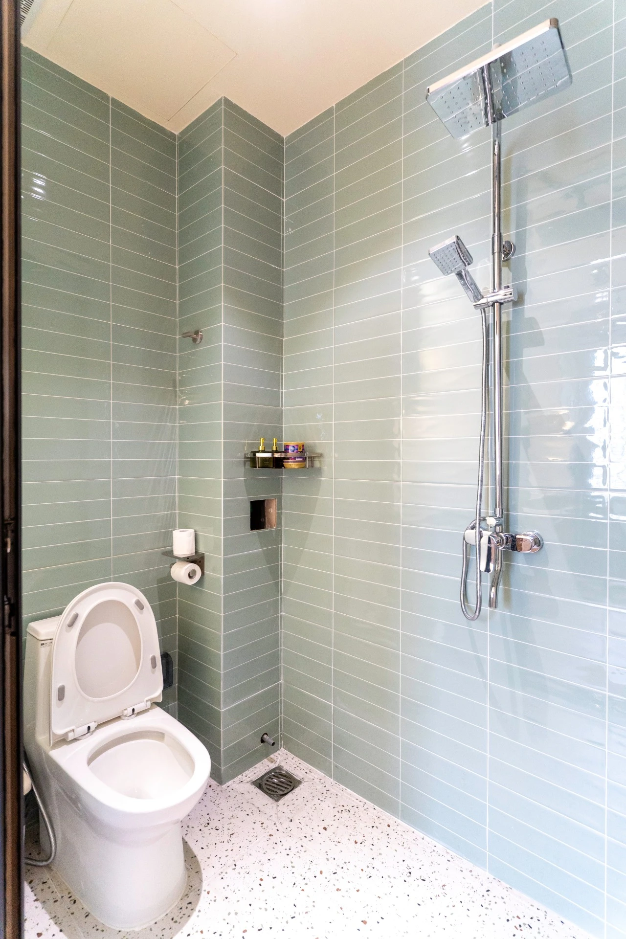 ✨ 민트 그린 톤의 투명 유리 욕실, 레인 샤워 + 고급 액세서리가 완비된 변기